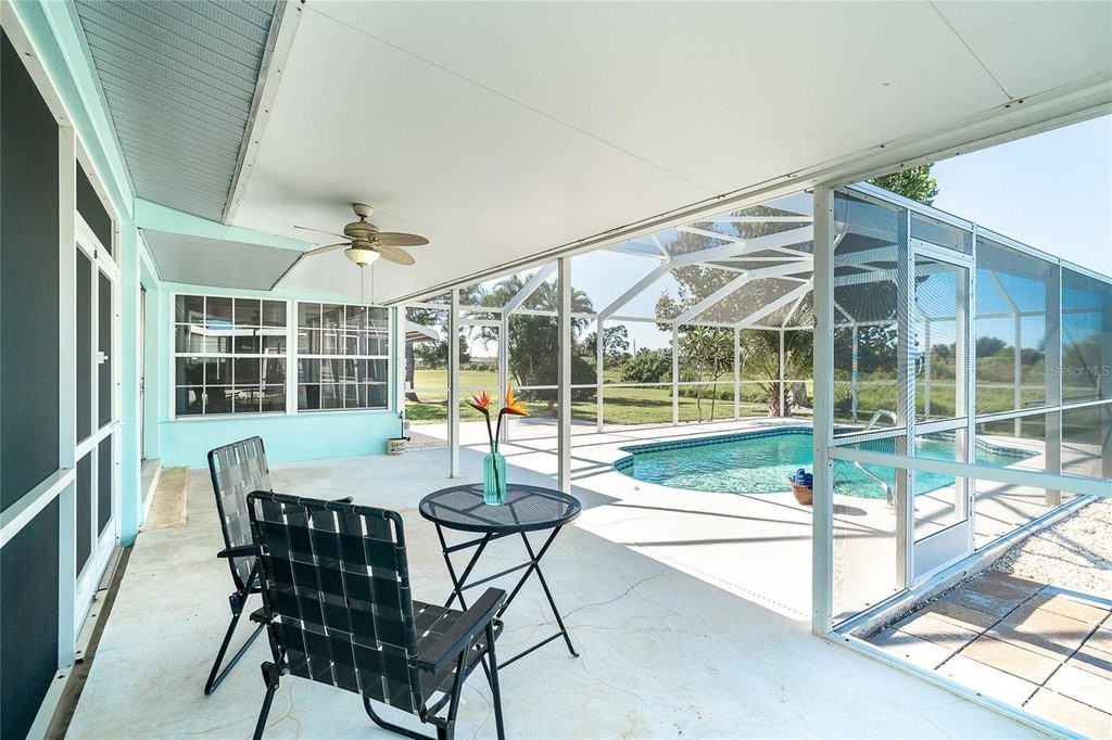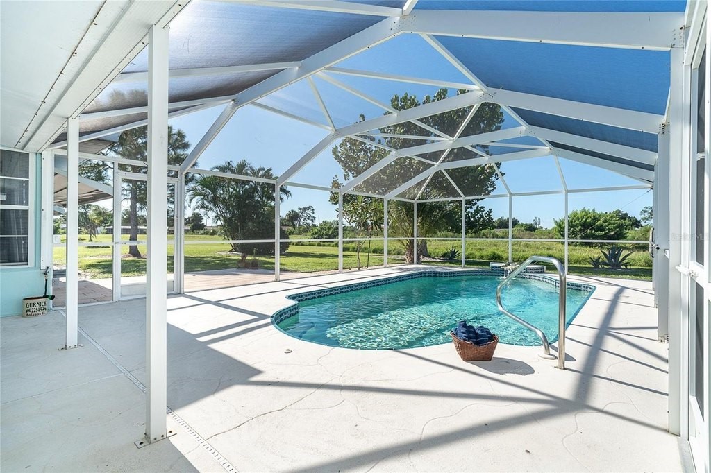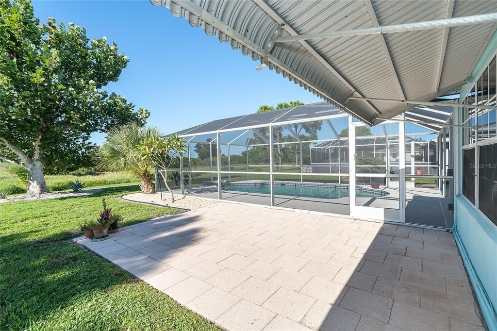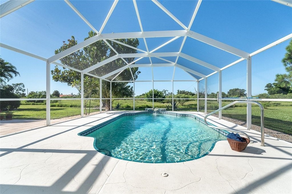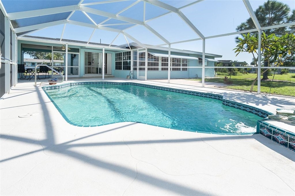 One or more photo(s) has been virtually staged. Located on a quiet street, this charming 2-bedroom, 2-bath pool home blends a retro mid-century vibe with thoughtful updates and has been beautifully maintained. The open floorplan extends into a Florida sunroom, adding extra living space filled with natural light, while the backyard overlooks what was once a golf course and is now open greenspace, offering privacy and a peaceful natural backdrop. Major updates provide peace of mind, including a new roof in 2020, HVAC system in 2025, and hot water heater in 2021. Nine impact windows were installed in 2021, with the lanai sliders remaining original but paired with convenient pull-down shutters. Inside, the home has been freshly painted with all tile floors cleaned and sealed, featuring terrazzo and ceramic tile throughout for a low-maintenance lifestyle. The kitchen is both functional and private, with a built-in oven and ample cabinetry that keeps the mess tucked away when entertaining guests. The spacious primary suite comfortably fits a king-size bed and includes a walk-in closet and private bath with a walk-in shower, while the guest bath is also generously sized with excellent storage. Outdoor living shines with a sparkling pool, newly rescreened cage, stamped concrete decking, and plenty of room for dining, lounging, or enjoying the sun. The pool pump was replaced in 2025, adding to the long list of completed improvements. Additional storage and laundry space are located just off the carport, providing room for your washer, dryer, and more. In desirable Flood Zone X, this property requires no flood insurance and has no history of claims, plus there are no HOA fees. Conveniently located near schools, shopping, restaurants, golf, fishing, and hospitals with quick access to I-75, the home is just 30 minutes to the beaches of Manasota Key and Boca Grande and close to the new Sunseeker Resort, Downtown Punta Gorda, and Fisherman’s Village. With everything already done, this home is move-in ready so you can start enjoying the Florida lifestyle right away.